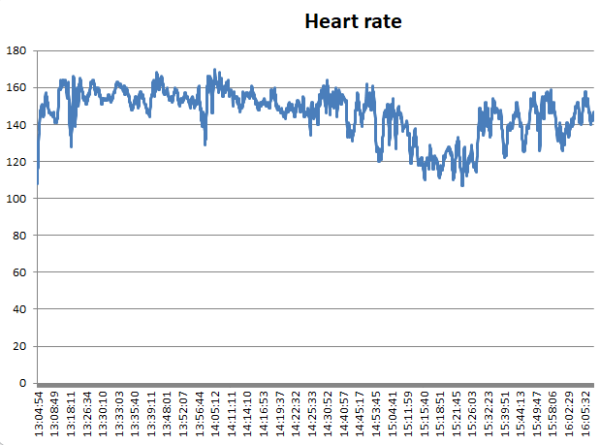 Enligt min pulsmätare var min genomsnittspuls 145 och min maxpuls 170. Snittet sänktes tydligt när jag stannade för att rengöra handtag och byta handskar.